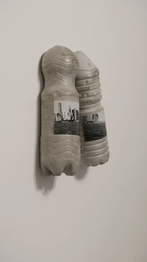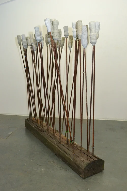 I was in Saudi Arabia on a building site and I admired the improvised use of water bottles, they cover rebar ends to remove the hazard of poking your eye out. This inspired me to collect water bottles from Saudi Arabia & Qatar, and cast them in concrete on rebar stalks. Both countries are going through a rapid building boom. Fresh water is a valuable commodity there where a litre of drinking water is more expensive than a litre of petrol. The process transforms a translucent vessel into an opaque object, revealing the intricate geometry of the design and surface.